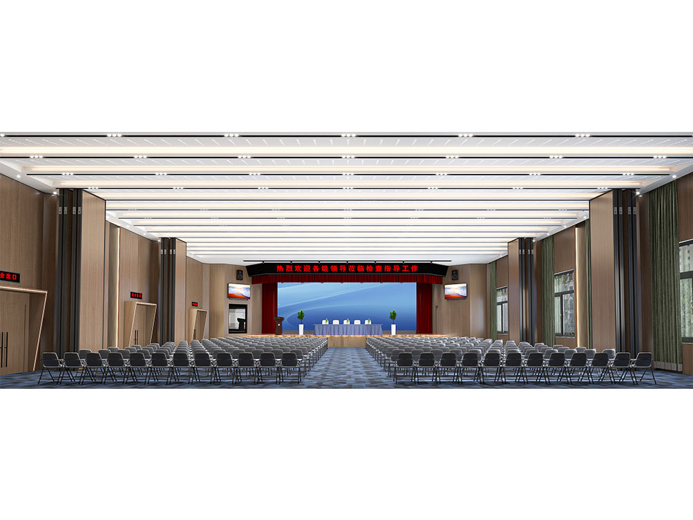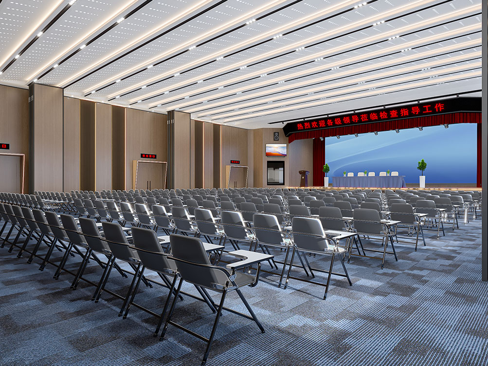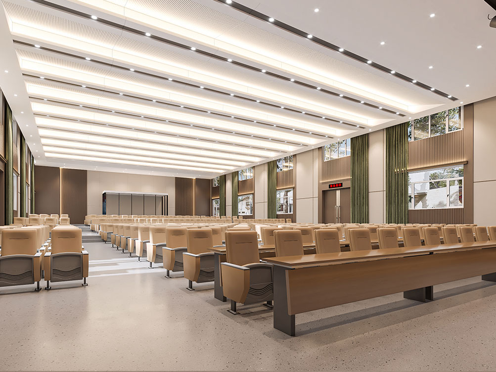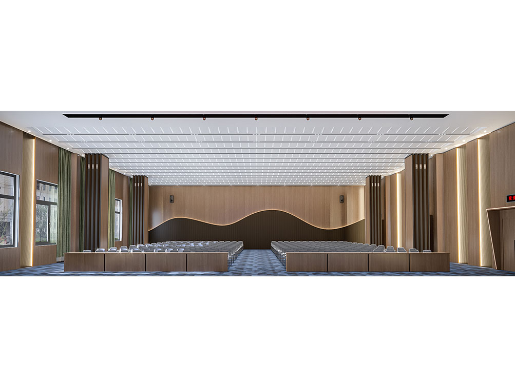 设计理念: 作为济南办公室装修中大型功能空间的代表,该大堂报告厅以沉稳木饰面 + 金属线条铺陈基调,顶部穿孔吊顶搭配嵌入式灯光,兼顾声学与视觉通透感。巨幅电子屏 + 对称音响设备适配会议、汇报需求,米色座椅与红色台阶营造庄重又舒适的氛围,是济南办公室装修中高规格功能空间的典型设计。