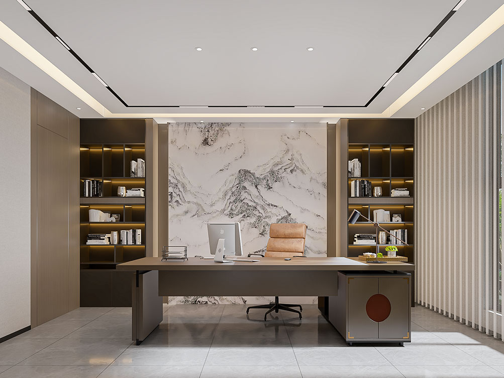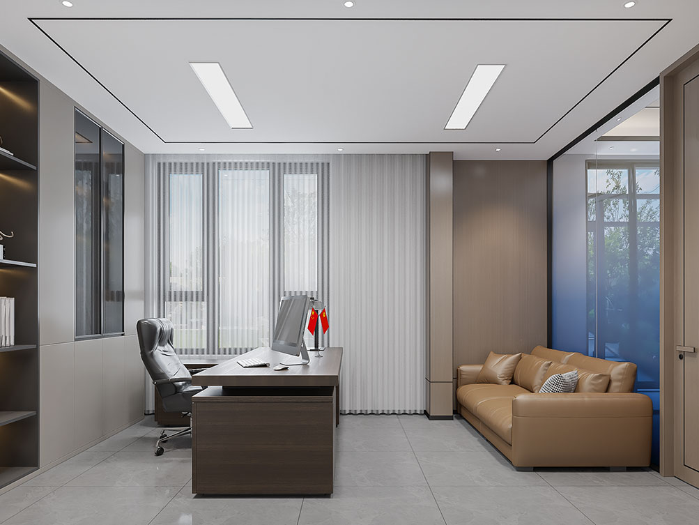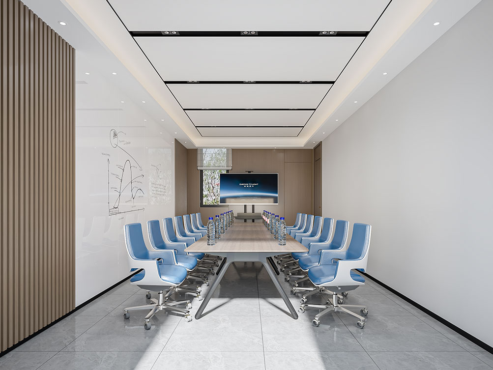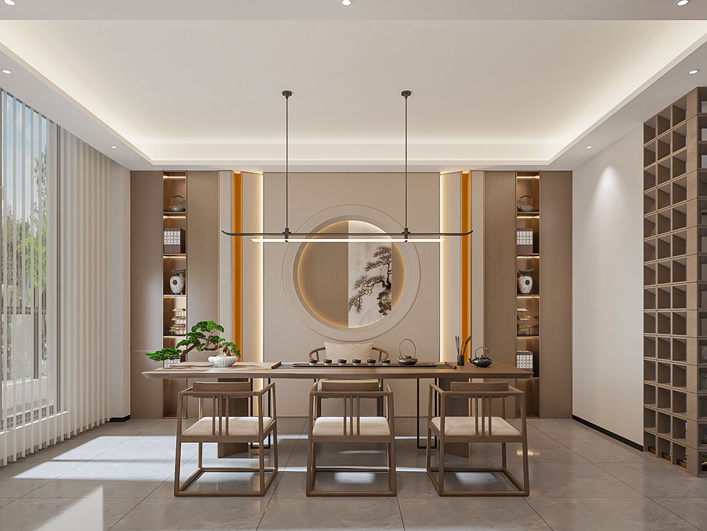 设计理念: 作为济南办公室装修中文化感休闲空间的代表,华达茶歇室以新中式风格为主调:原木茶桌搭配简约禅意座椅,背景注入东方韵味,嵌入式灯带与陈列柜烘托雅致氛围,既契合济南办公室装修商务接待的功能需求,也以温润质感消解办公疲惫,是济南办公空间中人文休闲区的优质范本。